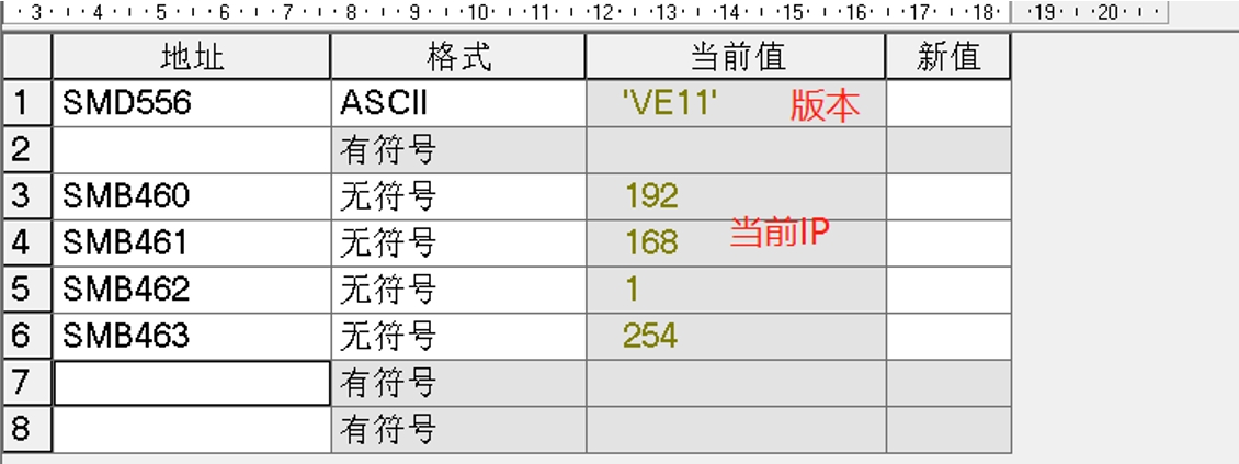 从VE11版本后的PLC提供特殊地址SMB460~463来显示当前的IP。在触摸屏上通过数值显示控件关联地址SMB460~463来显示当前的IP