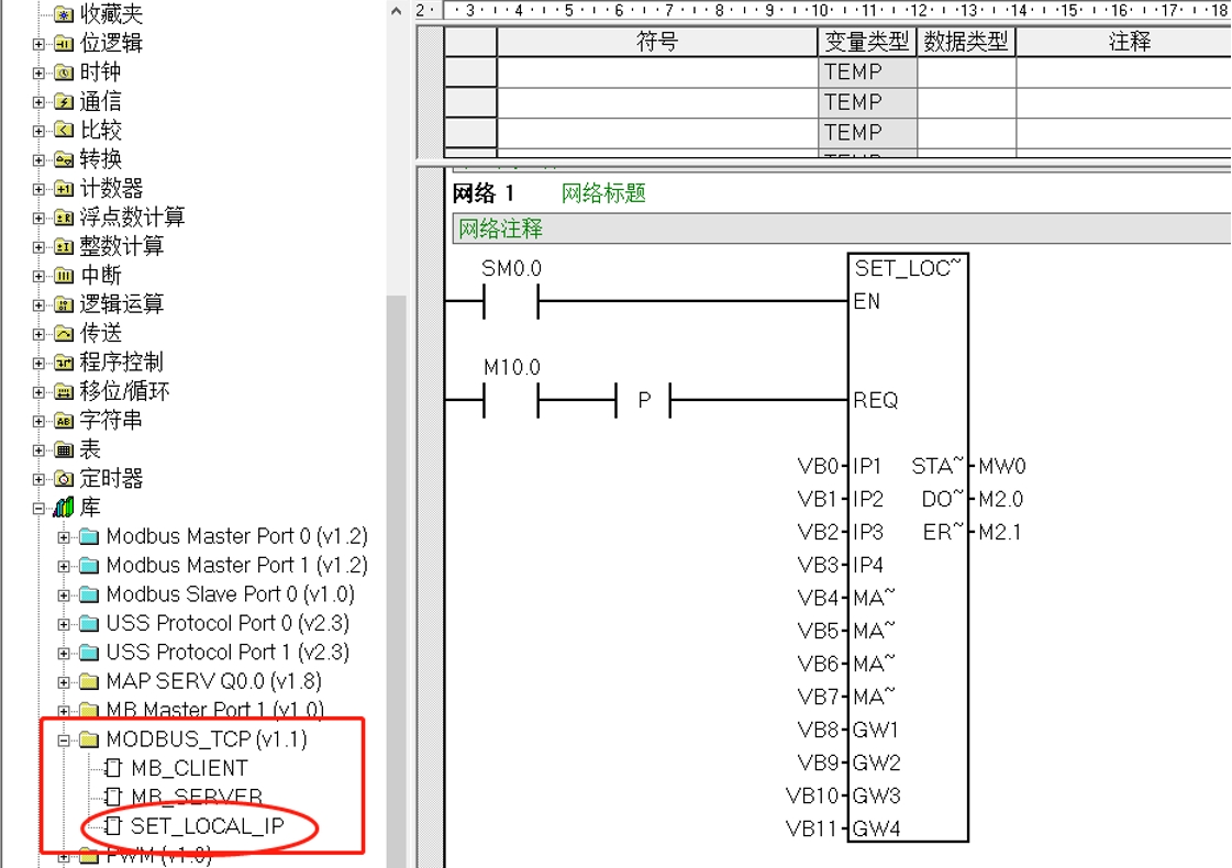 通过库指令SET_LOCAL_IP来设置CPU的IP地址。如下图,相关接口填入地址,并且在触摸屏上关联相关地址。填入新的IP地址、子网掩码、和网关地址后,通过触发M10.0产生上升沿,设置CPU新的IP。然后CPU断电重启后,新的IP生效.