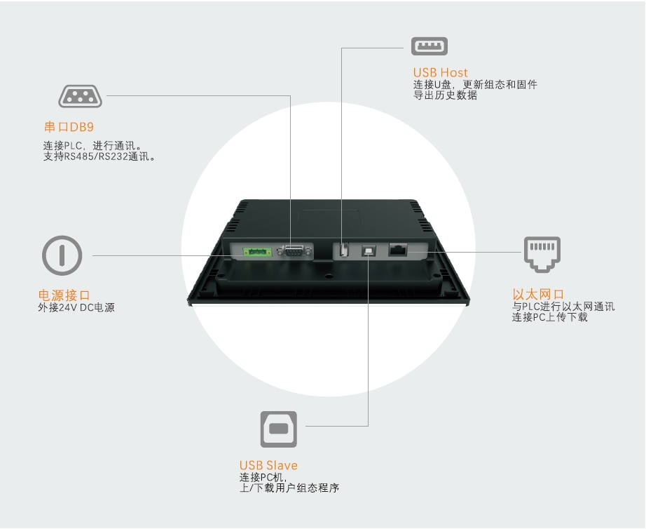 | USB Host | USB2.0 x 1, Type A(USB1),支持U盘更新固件、组态和存储数据 |