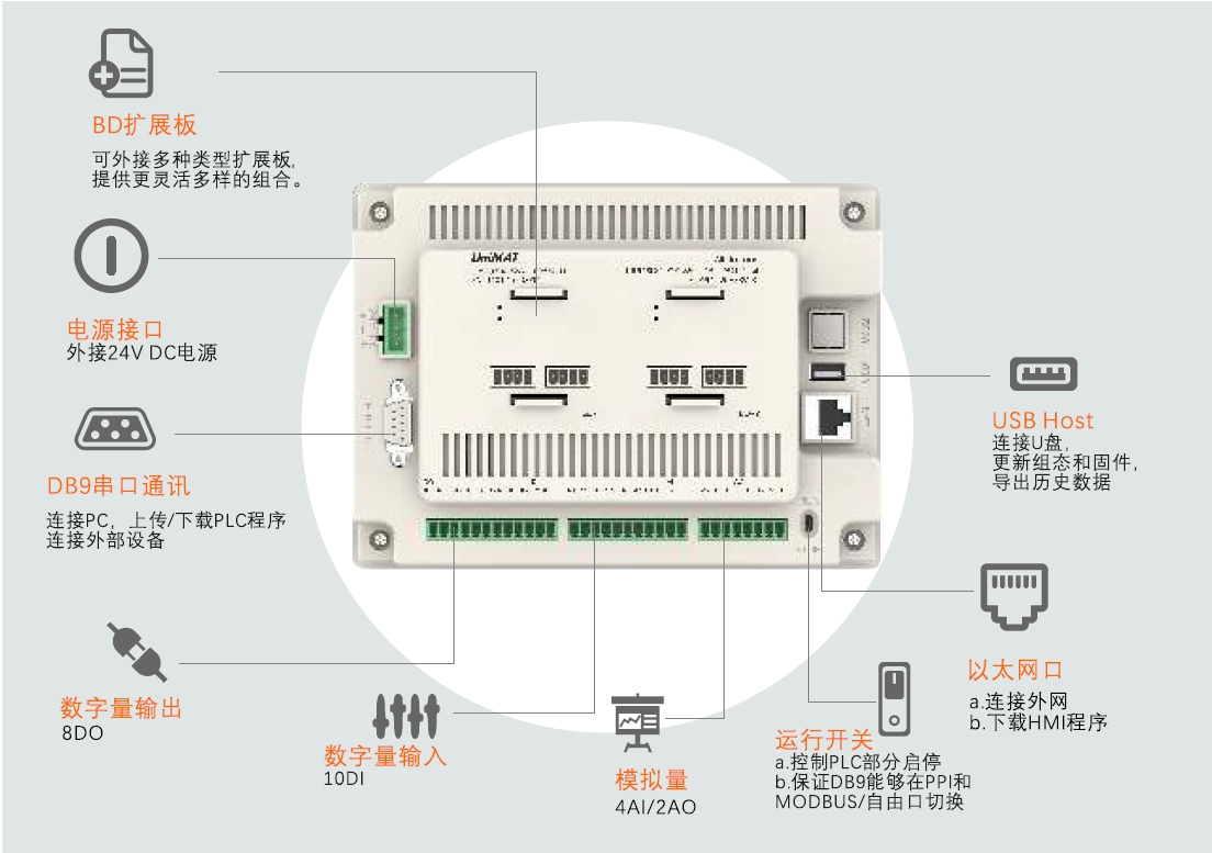 | USB Host | USB2.0 x 1, Type A(USB1),支持U盘更新固件和组态 | ||||