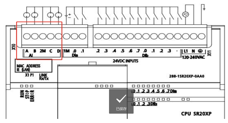 ABCD是4个模拟量输入的公共端,地址分别是AIW0 AIW2 AIW4 AIW6. 中间的2M是4个模拟量输入的公共端。4个模拟量输入可以是电压或者电流,默认电压。