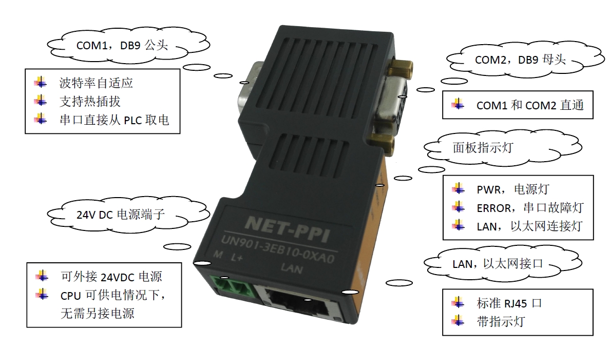 PPI转以太网适配器可用于UN120L、200系列CPU编程,程序监控调试以及连接OPC组态软件等。