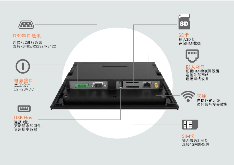 | USB Host | USB2.0 x 1, Type A(USB1),支持U盘更新固件、组态和存储数据 | ||