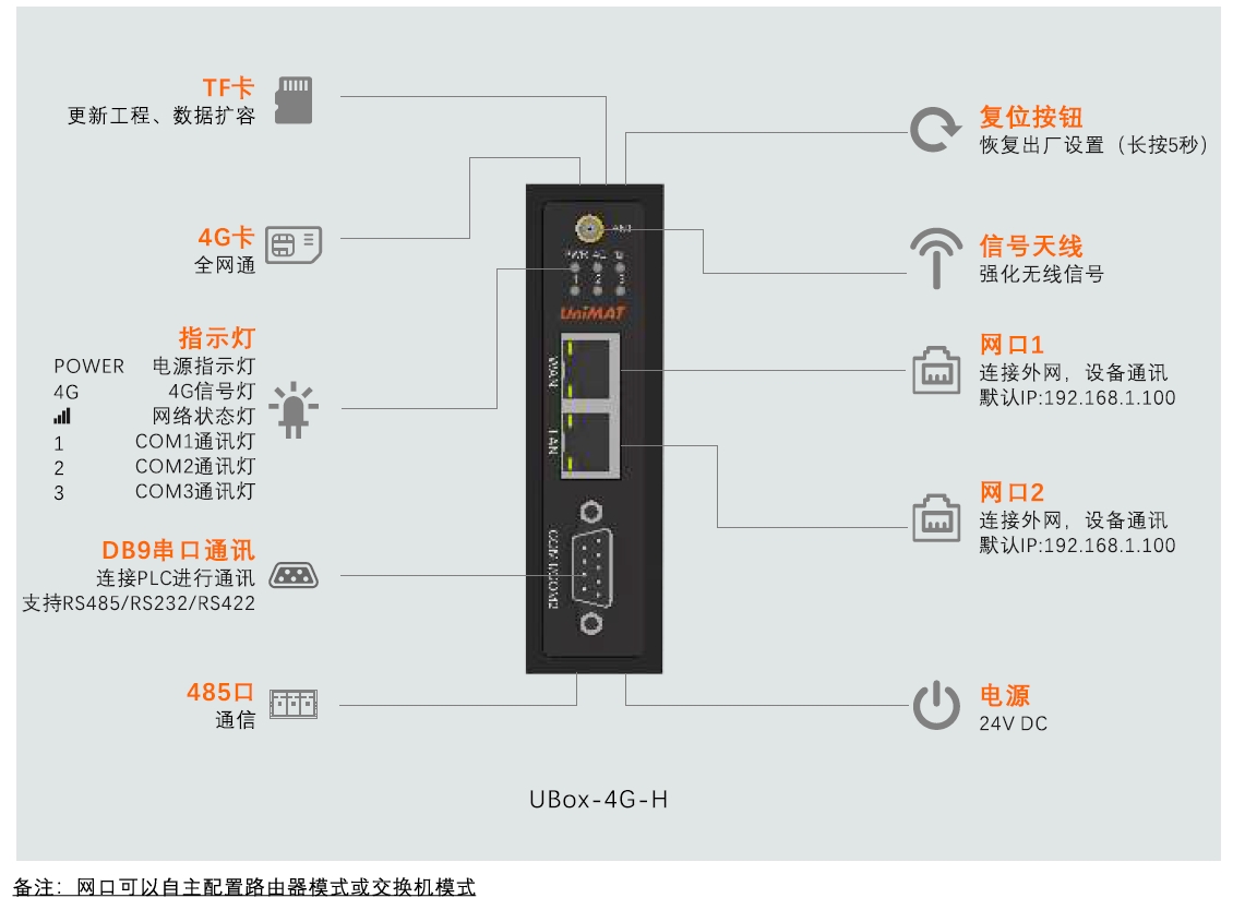 | TF卡 | 支持TF卡更新固件和配置 | ||